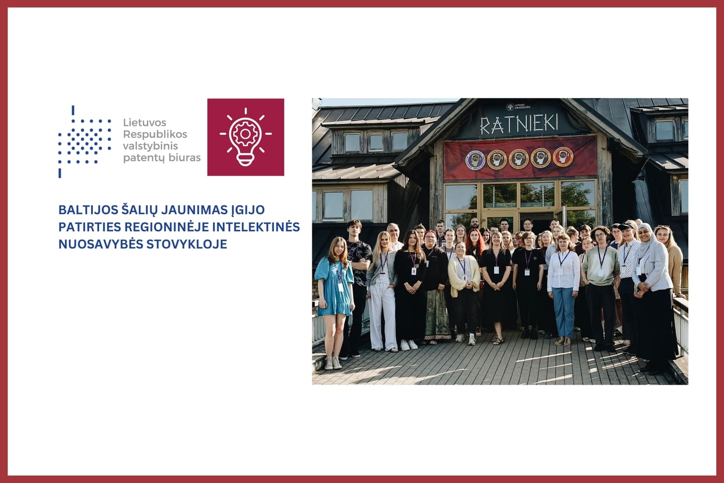 Rugpjūčio 19–22 d. „Ratnieki“ konferencijų centre, Latvijoje, studentai iš Baltijos šalių dalyvavo pirmoje Regioninėje Baltijos šalių intelektinės nuosavybės jaunimo stovykloje. Renginį organizavo Pasaulinė intelektinės nuosavybės organizacija (WIPO) kartu su Latvijos Respublikos patentų biuru, Estijos patentų biuru ir Valstybiniu patentų biuru (VPB).
