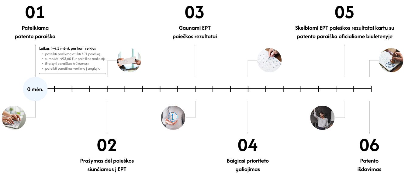 EPT paieška atliekama per 9 mėn. nuo patento paraiškos padavimo VPB datos (prioriteto datos). Pareiškėjas, gavęs paieškos ataskaitą, dar turi laiko ją įvertinti ir priimti sprendimą dėl patentavimo užsienyje. Norint išsaugoti prioriteto datą, apsispręsti dėl patentavimo užsienyje reikėtų ne vėliau kaip per 12 mėn.